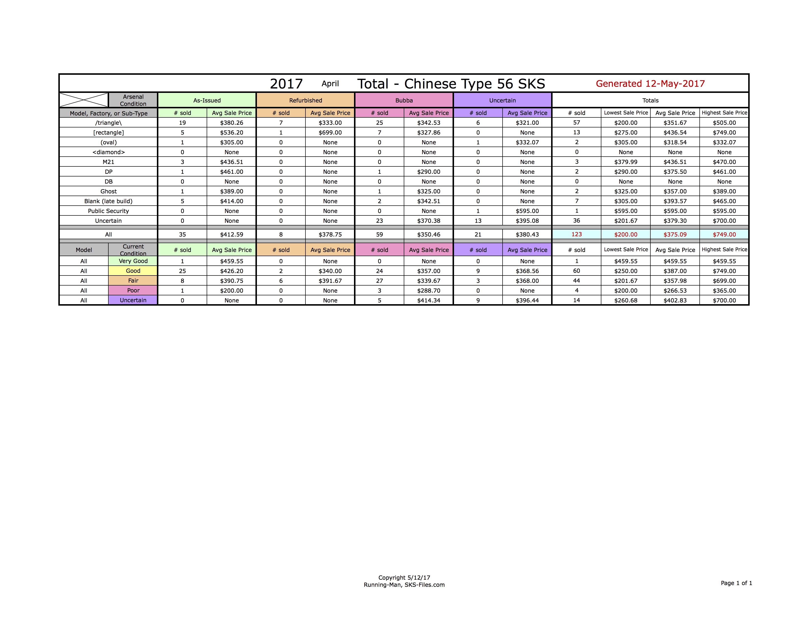 • 640191845 | Type 56 Chinese SKS, Matching, Albanian Use | 1 | $365.00  | /triangle\ | Bubba | Poor | Not sure what the guy working on the stock was attempting, but I'm pretty sure he failed.