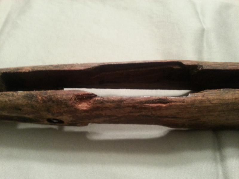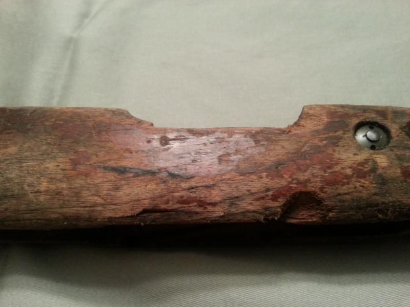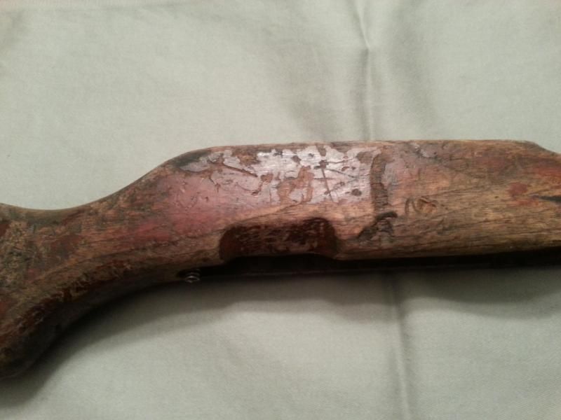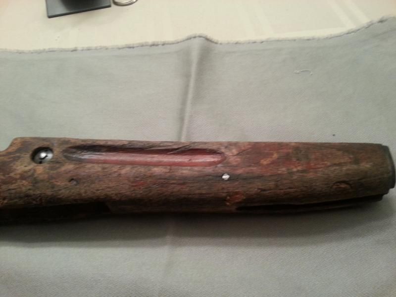 As you can probably tell I did very little sanding. I just knocked off the rough edges with some 150 grit. Most of the spots on the stock are so deep and cover a large area I would have had to sand the stock down to a tooth pick to get them all out. After taking some denatured alcohol and removing what little of finish remained all of the scars kind of grew on me. So I just left them be.