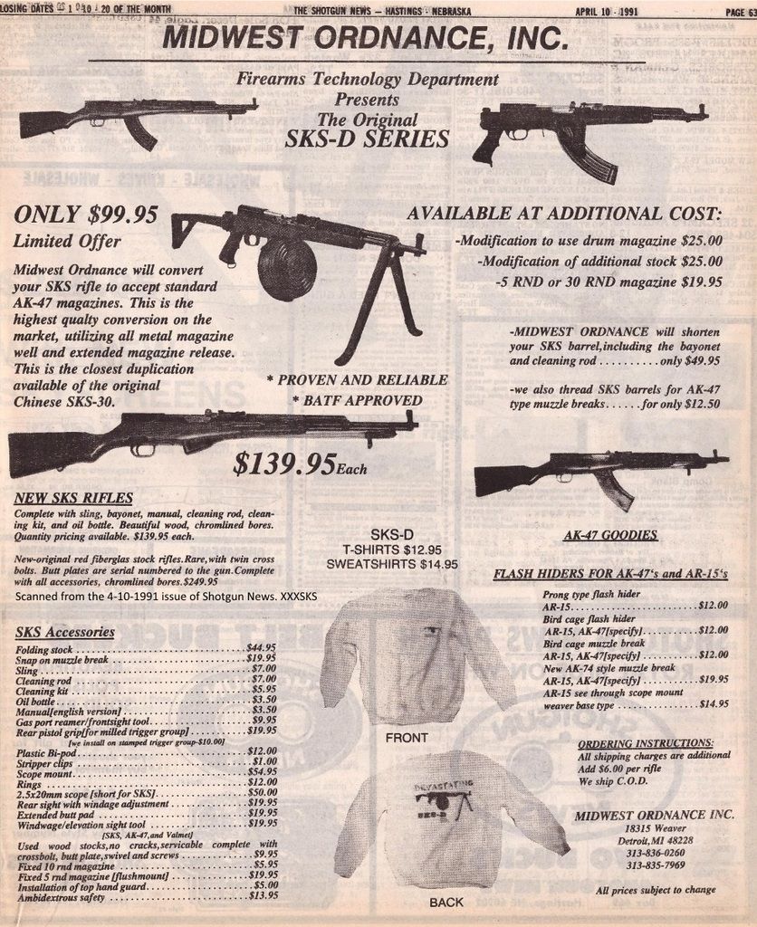 When I started searching these back issues of Shotgun News my goal was to find two specific ads the N.A. Assault Carbine Type 84 and the infamous Midwest Ordnance ad. The Assault Carbine is from 1984 and the MO rifles were before that. RIGHT? I searched through all of 84, 85 with no sign of either.  1986 and 87 nada. In 1988 the Detachable ads started showing up and I forgot all about those two. See the other thread for the N.A. Assault Carbine Type 84. Would you believe I had to go all the way to 1991 to find this ad. So far three full page ads from FEB 1, 1991 to MAY 1, 1991. There are one aspect of the urban legend full of holes. They could not have shown the Chinese how to do it after the BATF told the to stop. This is 1991 folks the Detachable 20' got here from China in 1988. The Chinese education had to be prior to 1988 which is possible.