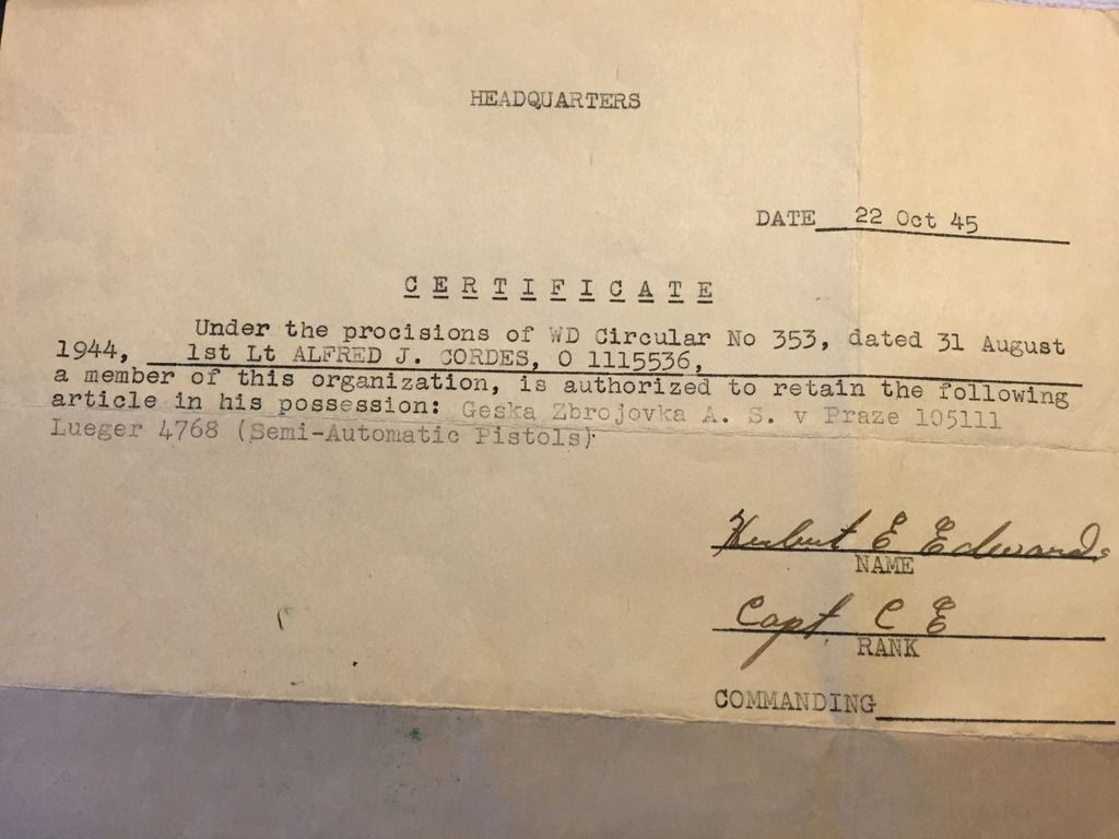 The first is his 1945 European theater trophy paperwork. They were usually made in triplicate and I have two copies, one with off-center type strikes. Notice how the paper is registering two pistols. Somewhere out there is a lonely and paperless Czech pistol.