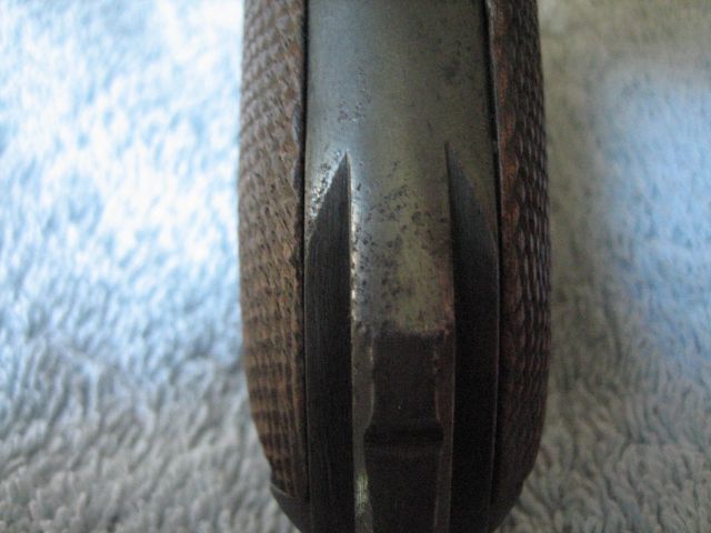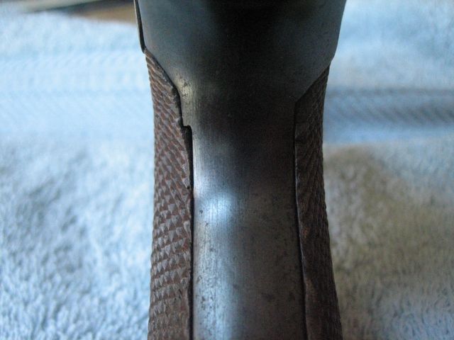 The grips are in very nice condition, no cracks, nicks, splits or gouges. Minimal flattening. There are a few tiny globs of green paint inside the checkering on the left grip.