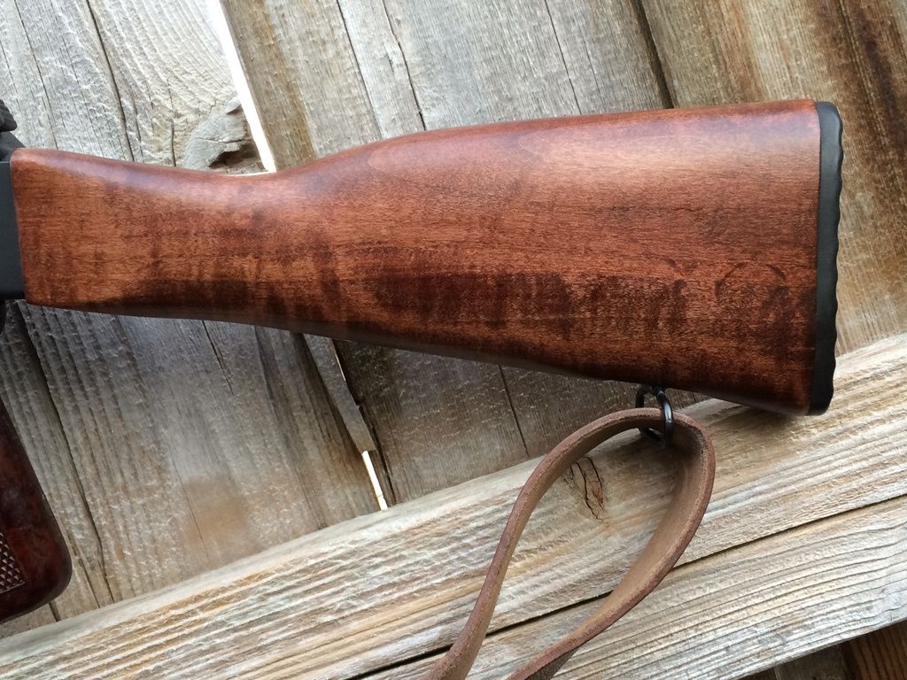 Went the cheap route to start  :))  Picked up a "bakelite" Romanian pistol grip for $7 from Desert Fox Sales and a leather Romanian sling using my eBay bucks plus $6.  I stripped the furniture of finish and applied a base of Minwax Red Mahogany followed by English Walnut to make it a bit more brown. The ash, or whatever this wood is, didn't like to soak up stain very well. I already had a couple of Romanian bayonets in the bayo bucket, so that accessory was easy. I may need to dull that lacquer finish with another rub down from the steel wool. Not a perfect match to the medium dark reddish-brown color I had in my mind but fairlyl close, and I like it better than the blonde look.