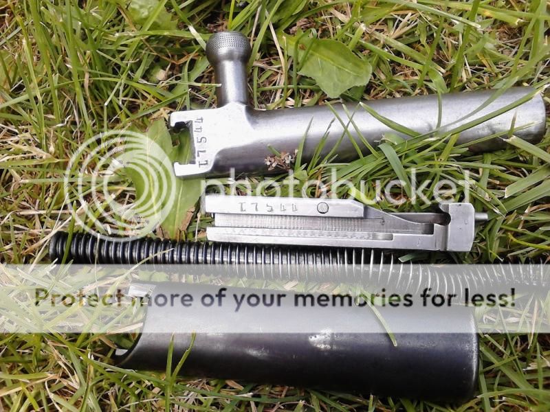 There appears to be no extraneous marks on the receiver or barrel, but the finish on the receiver, mag, and receiver cover appear almost more like parkerizing than bluing, probably just wear and oxidation though. It currently resides in a beautiful S series stock with correct red shellac ($10 at the gun show!). If anyone has S8672, I have your stock!  8)