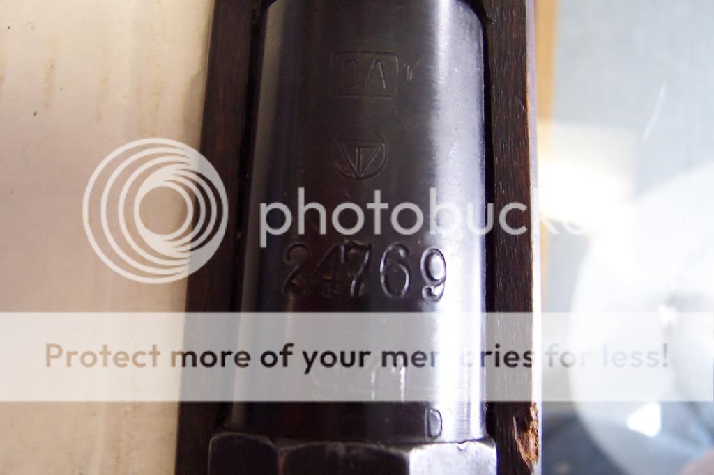 The barrel and receiver are blued, 2 piece finger groove stock, hex receiver, and finnish matched bolt and most other S/N's are just ---- lined out. Early barrel bands, finnish sling attachments in the dog collar slots, and mostly Izzy arrow stamps on the parts.