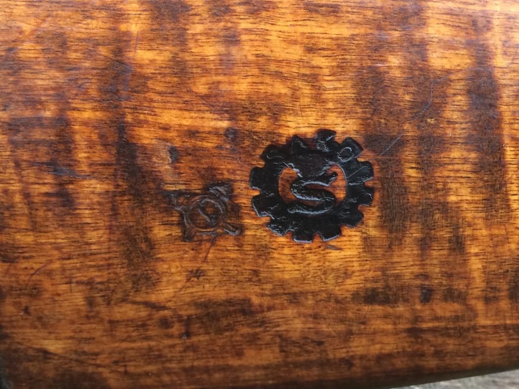 The stock is of WWII manufacture since it has the rounded finger joint rather than the transitional triangular or post-war square joint.  Also, the stock was made by Sakara Oy as indicated by the S in the crossed-cannons cartouche.  It's interesting that the 1900г and the Izhevsk bow and arrow are embossed onto the wood from the tang, which indicates that it's been in this stock for a long time.