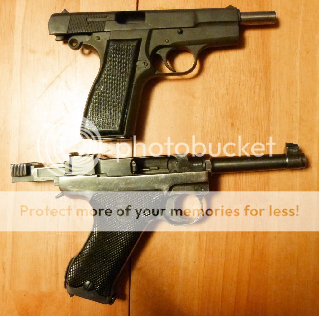 Hey folks, just thought I would share my latest GB buy. Its probably made by FEG with fake FN stamping. Its all matching numbers and relatively tight with a nice bore. My first handgun was a Browning Hi Power new in 81 but I sold it to a friend who wanted it for his part time cop duty gun. Anyway, I was never a big fan of the 9 but all ways liked Brownings last design before he passed away. So for the winning bid of $280, and $347 OTD of my local Pawn shop, its in its new home. Should be a good shooter from the looks of it. I thought I would do a size compare with my Lahti M40. Same barrel length on both guns but big difference in size and the Lahti is an artillery piece at 3/4 lb heavier. I still like it tho....
